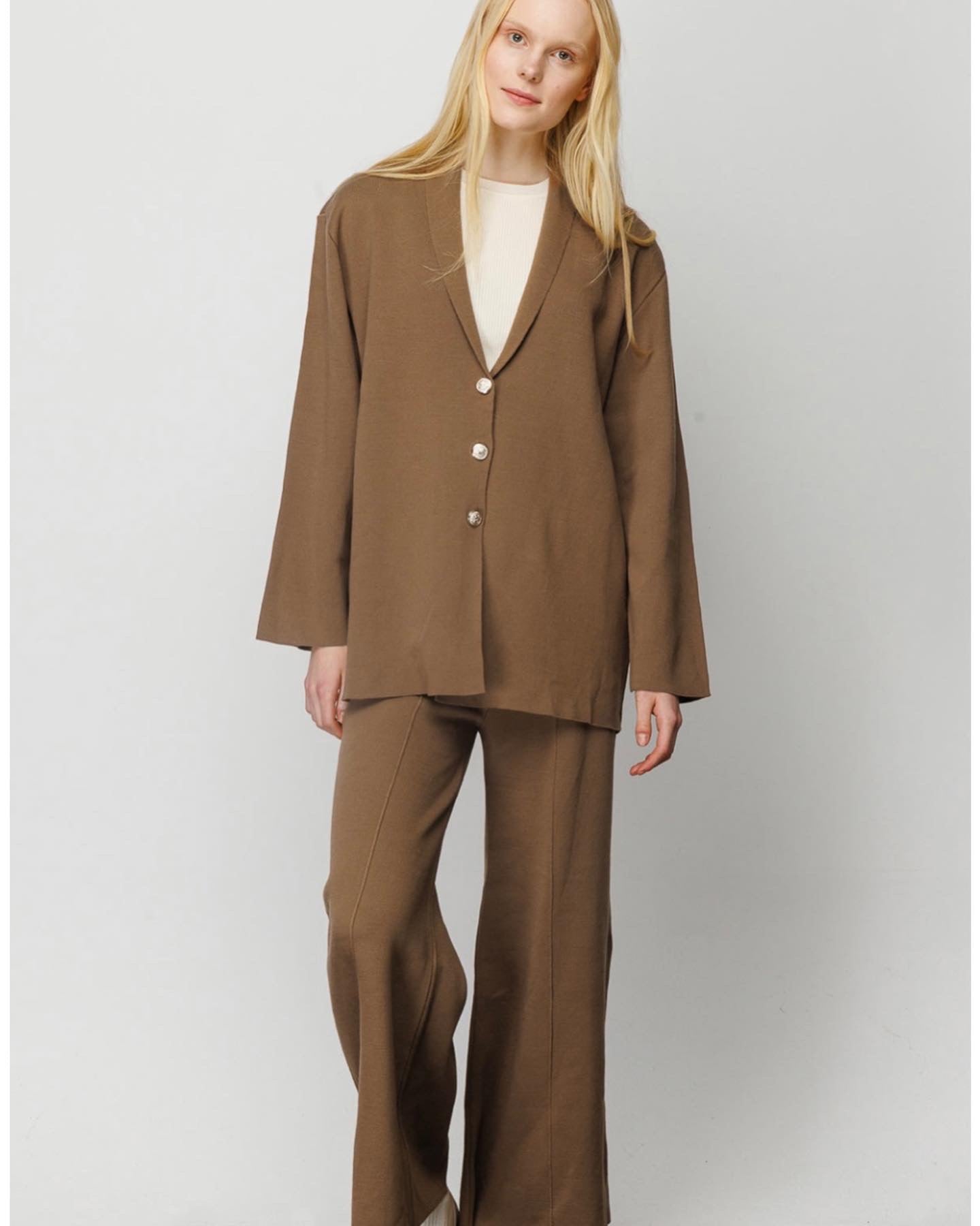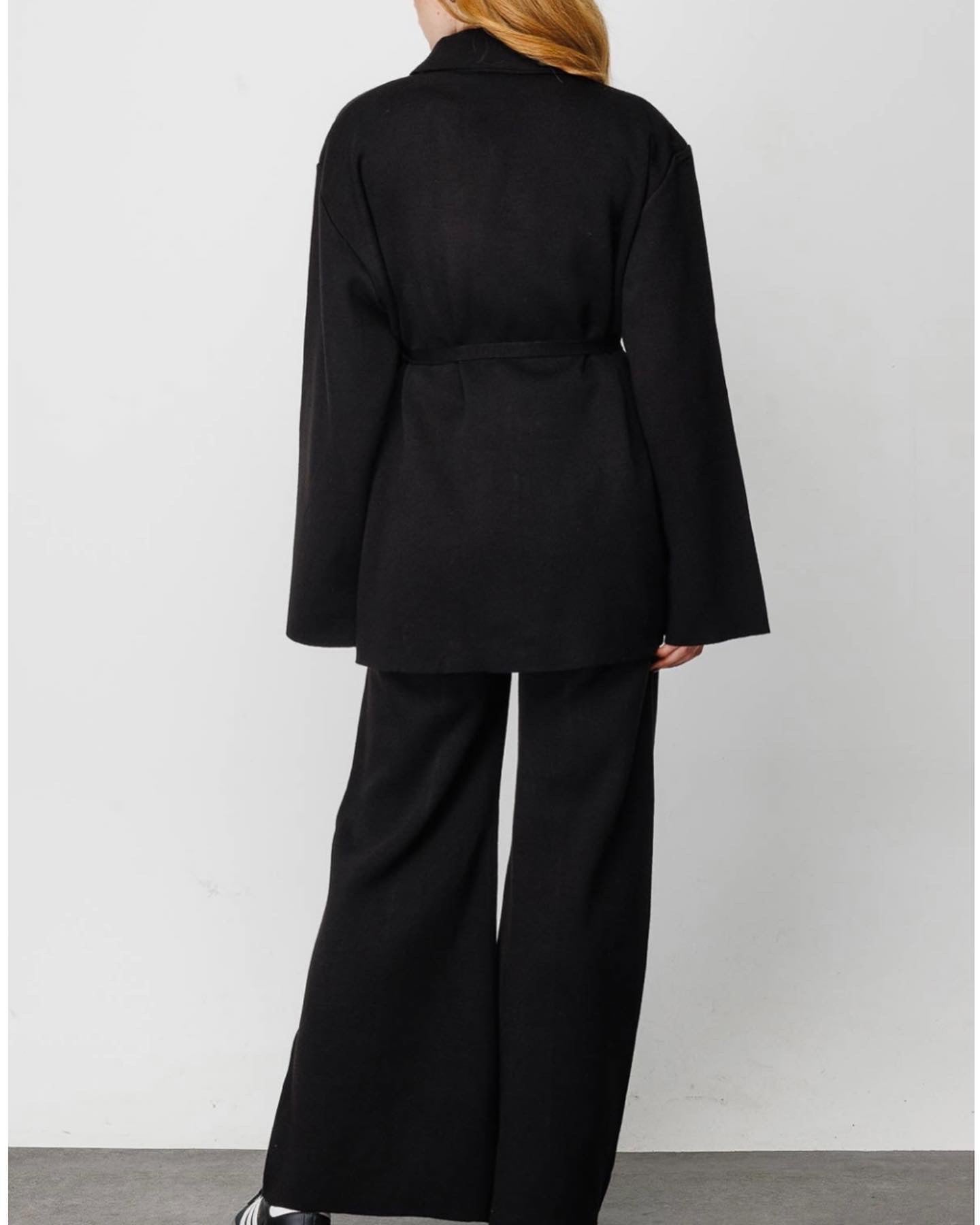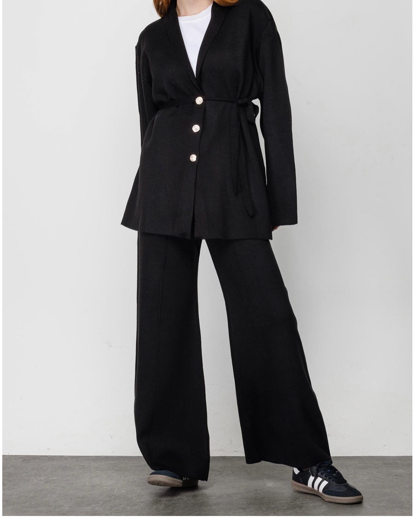 Schalkragen, metallisiertes Knopfdetail vorne, niedrige Schulter, bequeme Passform Strickjacke und elastische Taille, verstellbare Taille mit Tunnel, Nahtdetail vorne, hohe Taille, hohes Mesh, spanisches Bein, bequemes Strickhosenset. Das mobile Band wird mit dem Produkt geliefert.