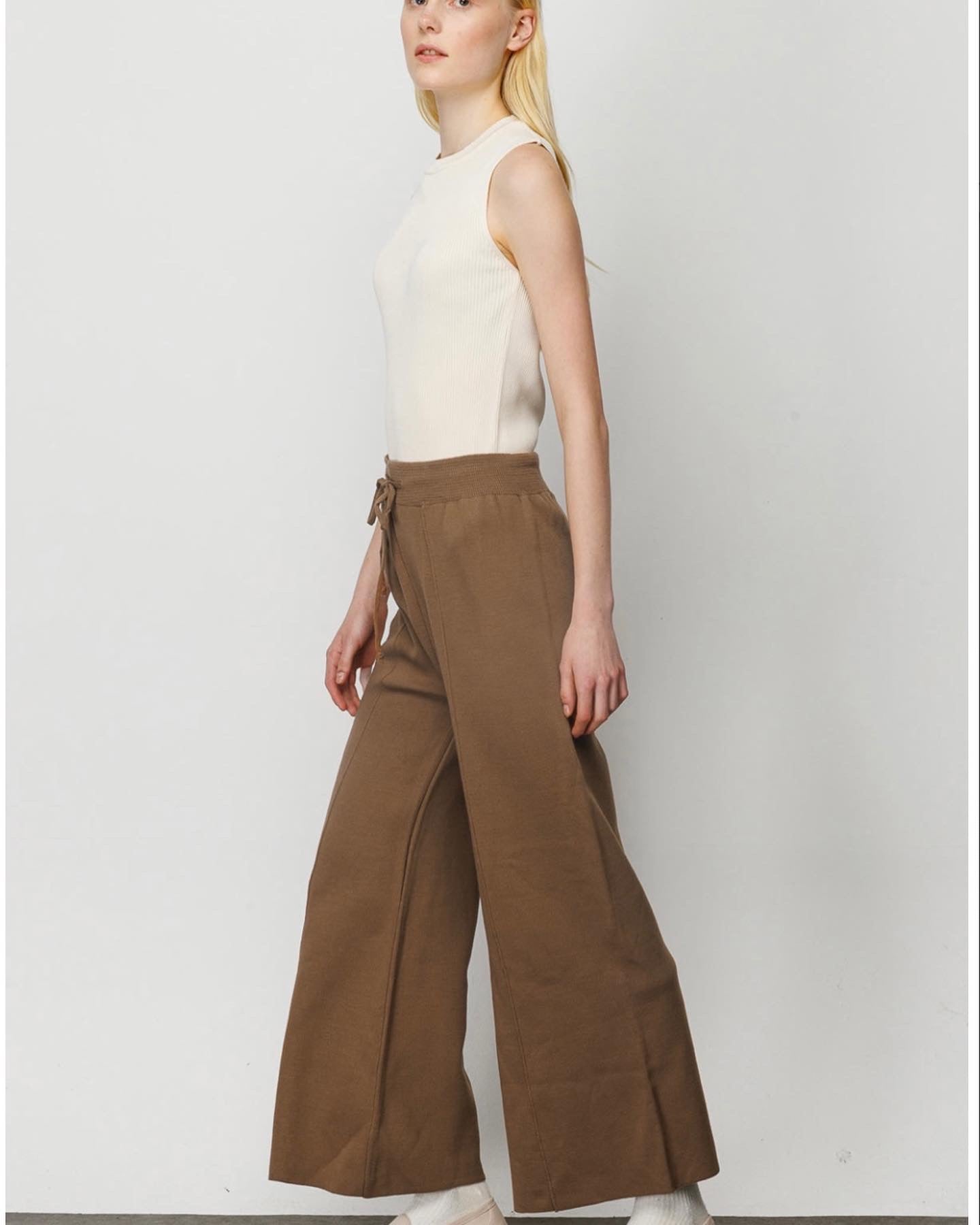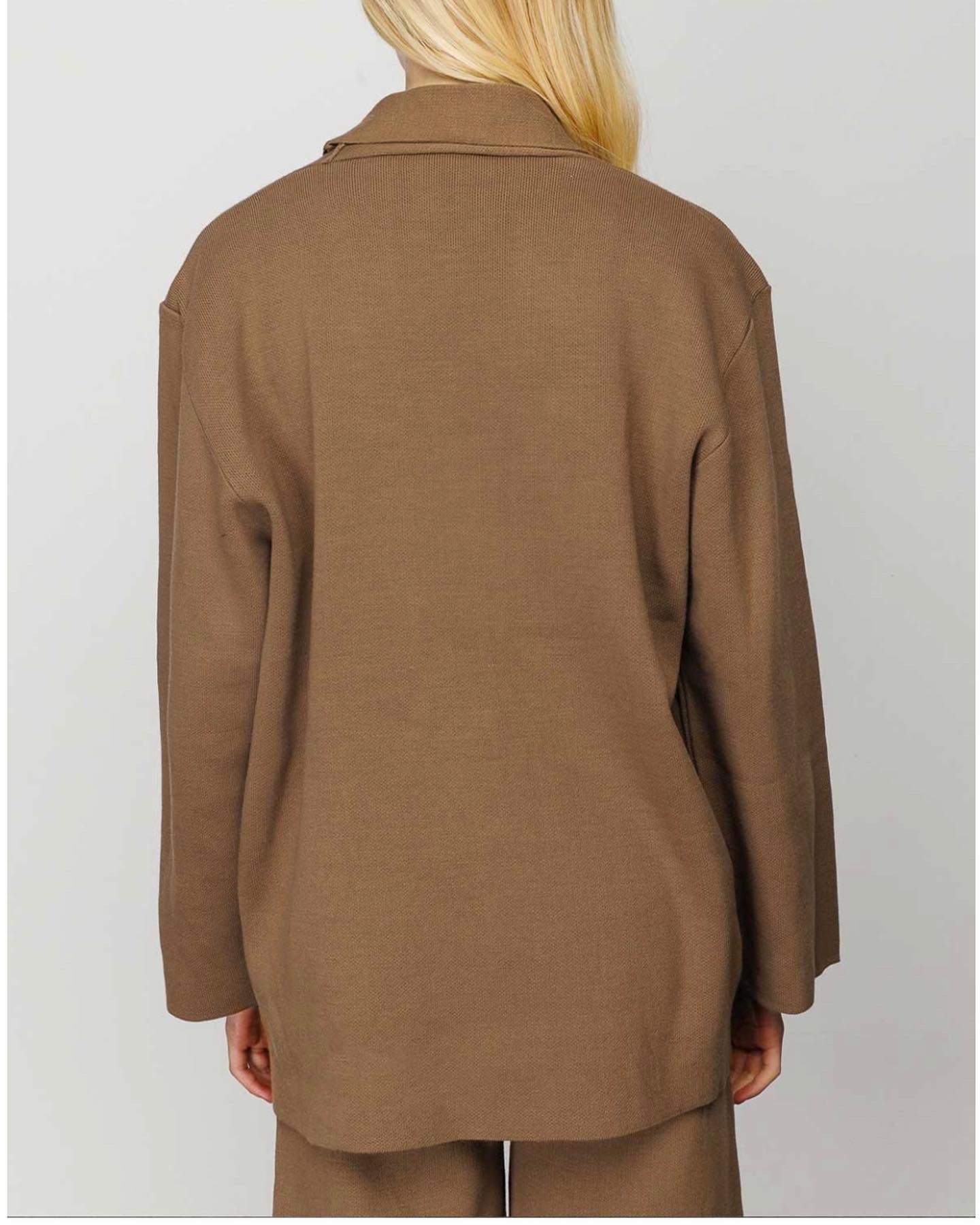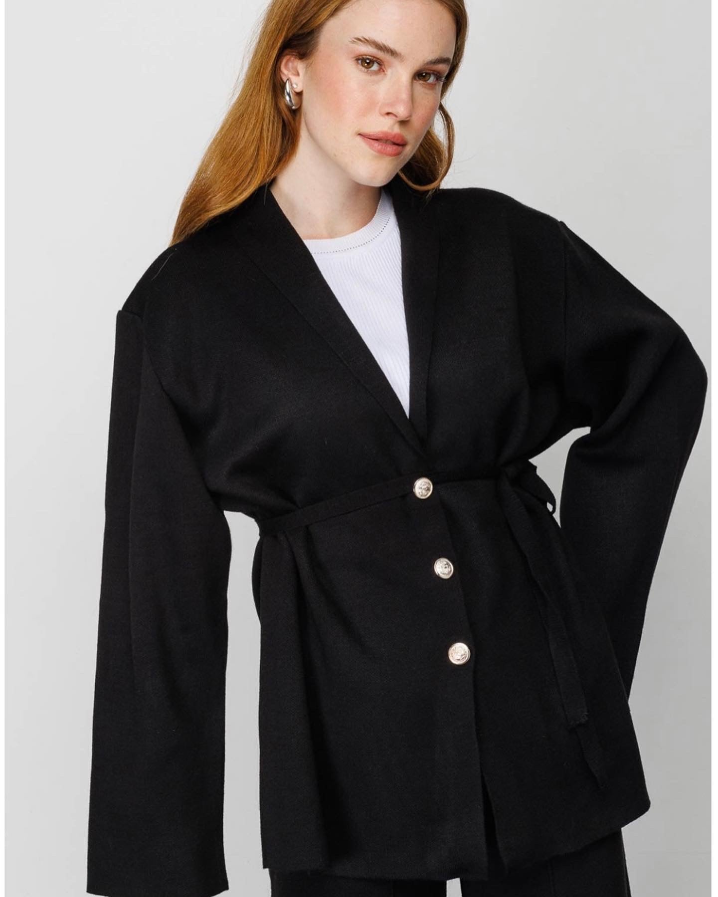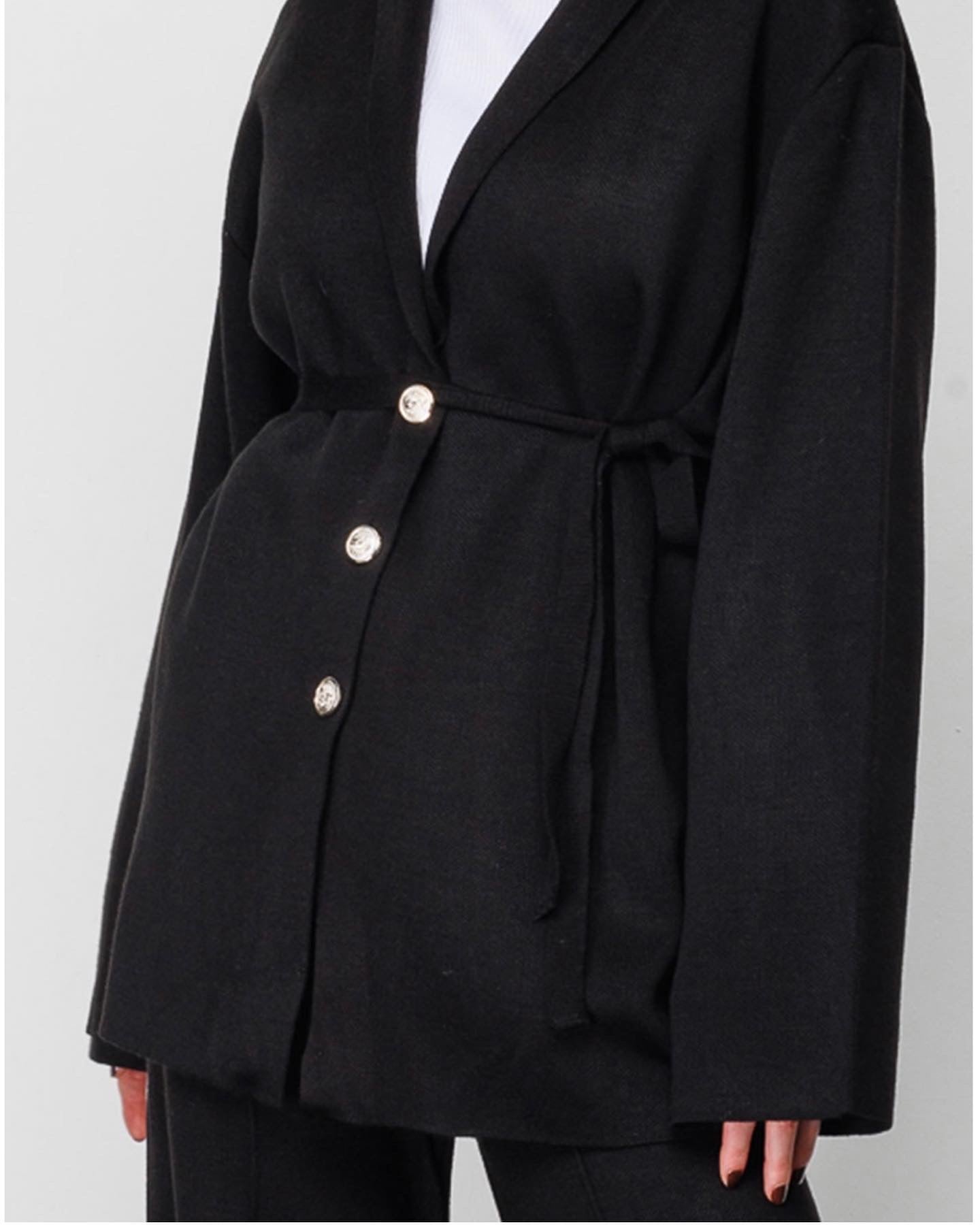 Schalkragen, metallisiertes Knopfdetail vorne, niedrige Schulter, bequeme Passform Strickjacke und elastische Taille, verstellbare Taille mit Tunnel, Nahtdetail vorne, hohe Taille, hohes Mesh, spanisches Bein, bequemes Strickhosenset. Das mobile Band wird mit dem Produkt geliefert.